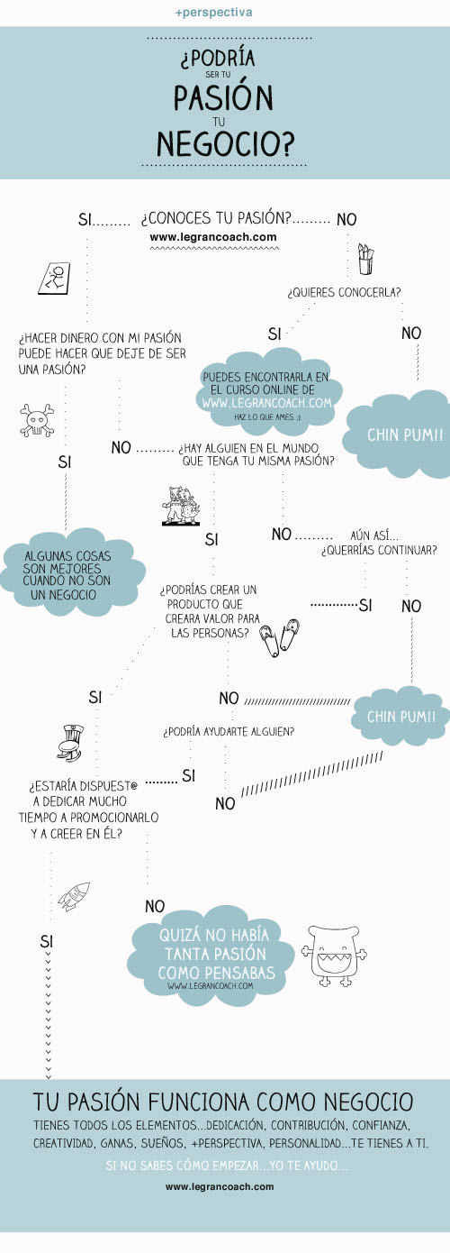 Mientras y para ir abriendo boca de todo lo que va a ir ocurriendo a partir de ahora te dejo con una infografía «made in +perspectiva» para que hagas tu propio test y saber si tu pasión puede ser tu negocio. Es una infografía sin grandes pretensiones pero que puede ayudar. Si te tomas tu tiempo para responder a las preguntas, no lo dudes, deja en la zona de comentarios todas tus reflexiones, dudas, inquietudes. Será un placer saber más de ti.